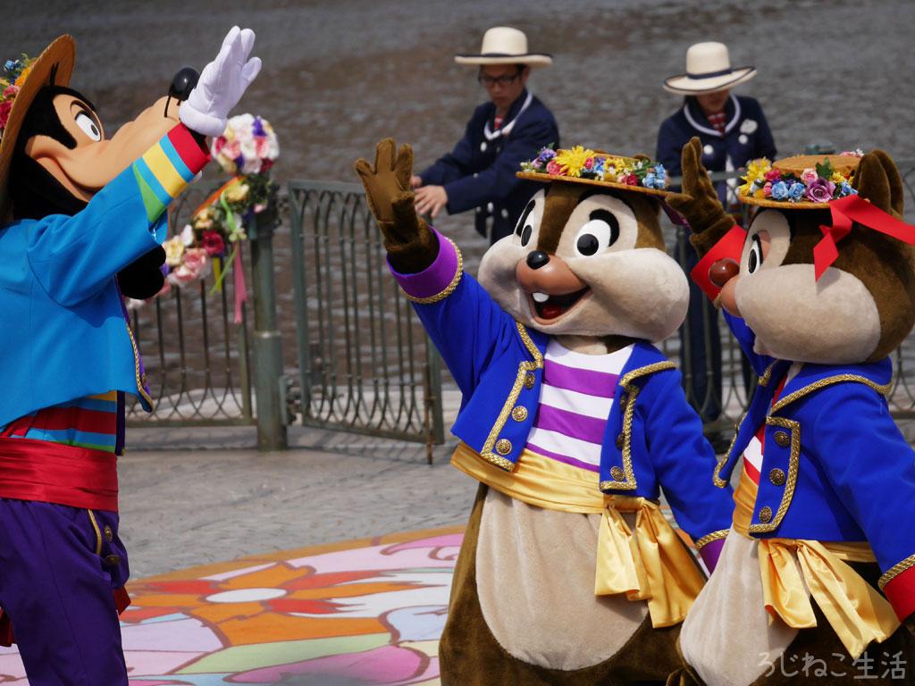 ハイタッチするグーフィーさんとチップさんとデールさん