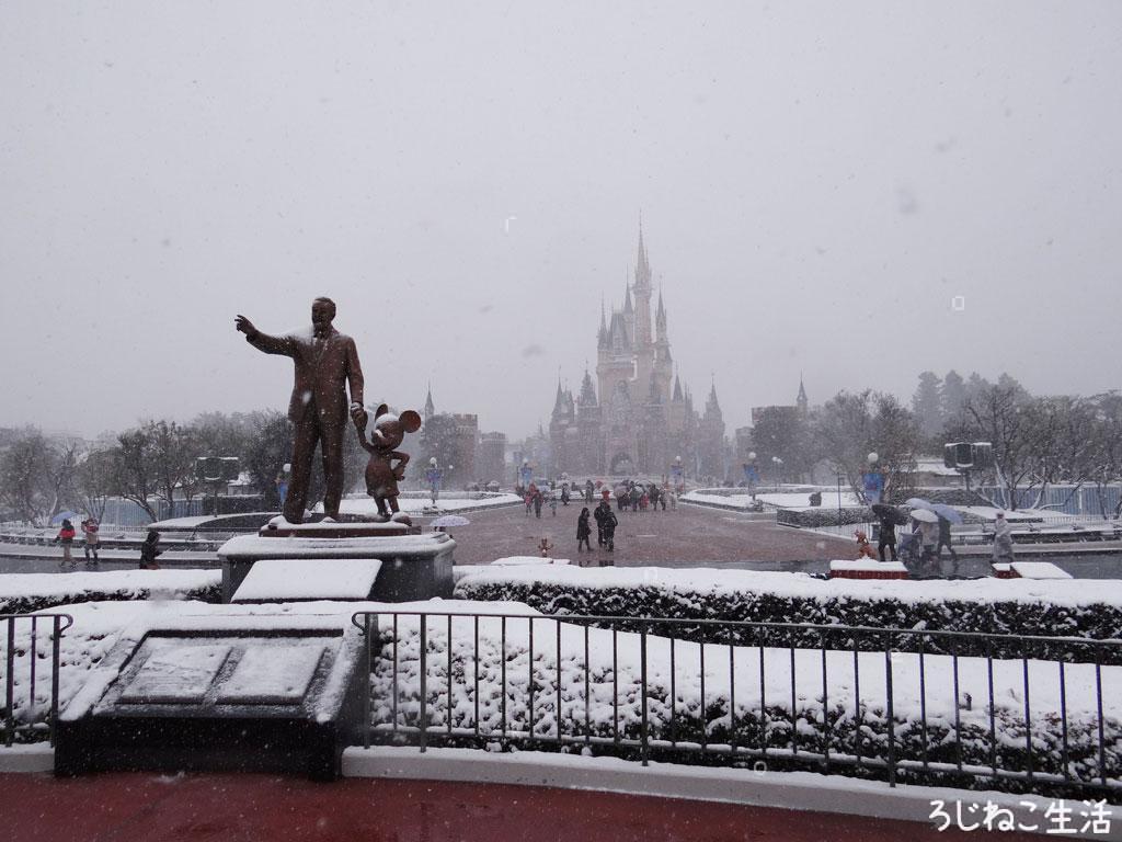 雪のウォルトディズニー像とシンデレラ城